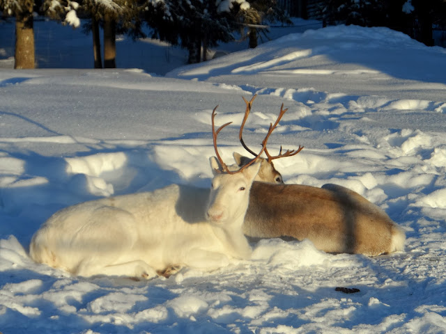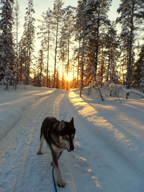 Daydreaming I left the 2 km track and wandered into the forest. I've never been there before. We followed one of the tracks. I took pictures and invited Miia to play with me. Miia is a fantastic old Lady. As one of the yet retired dogs she doesn't run anymore. She wouldn't be able to keep pace with the youngsters. Nevertheless she still enjoys to move a little. So since I had a day off, I took her on a walk in the woods after having trained the puppies. Miia is sweet, handsome, clever, for her age in perfect conditions and she has an astonishing orientation sense, unlike me. I got lost in the winter forest enjoying the sunlight and this beautiful landscape. Suddenly I recognized the silence, I couldn't hear the other dogs anymore. Their barking and howling have followed me into the woods even though soon I couldn't see them anymore. The trees covered with snow obscured my view. I looked around me and realized that the setting sun already coloured the white forest in shades of orange- Perkele, where the f...was I? Actually I don't even know it now that I'm back home, but Miia knew. At first I told her in English to bring me home. I couldn't remember the right word for 'home' in Finnish. My Finnish is still nearly not existent. So Miia just hold her head in a tilted positions and looked at me with a questioning expression in her cute dog face listening to my voice with perked ears-obviously her English was not that good. I had no cellphone, no map, no compass, no idea where I was... I started wondering about the traces a snowmobile left - according to my calculations it probably passed here yesterday. It did not snow over night and the traces did not look fresh...So how much time will pass until somebody passes here or starts wondering where I vanished...? :)