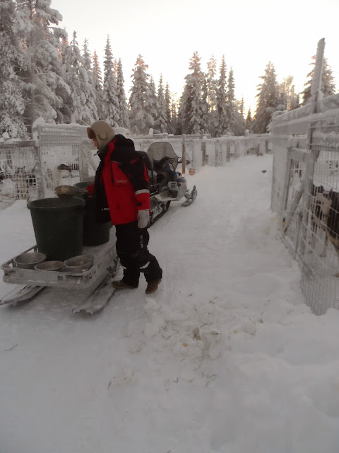 Every working day starts with the smell of dogshit. This is my perception at least. The good point is, that in this climate zone everything thaht touches the ground get frozen quickly. Once turned into ice it is nearly odourless and the only thing that lasts is the admittedly unsavory appearance. But this is something one get used to soon. We clean the fences always in pairs: One breaks the dog poop with a spade out of the ice and snow and the other gather it up with a rake and a kind of big dustpan. Cleaning after the dogs is actually one of the nicest work of the day. Sounds a little awkward, but it is actually relaxing. One can switch off the brain and just do. While cleaning we check, if the dogs are all ok. We ask them to leave their houses and greet us. Most of the dogs are already waiting for us, when we arrive. They like our equipement- I guess it smells interesting- and it is the only moment of the time when there is a minute to muck around with them and stay some extra minutes with ones favourite dogs. They are happy to get your attention and play, jump and watch intensively what we do with our cleaning tools. Some of the hairy darlings have the annoying habit to jump at or on my back, while I'm showeling their shit. I'm standing yet in dog poop, still somebody wishes to kick me in my ass. :)