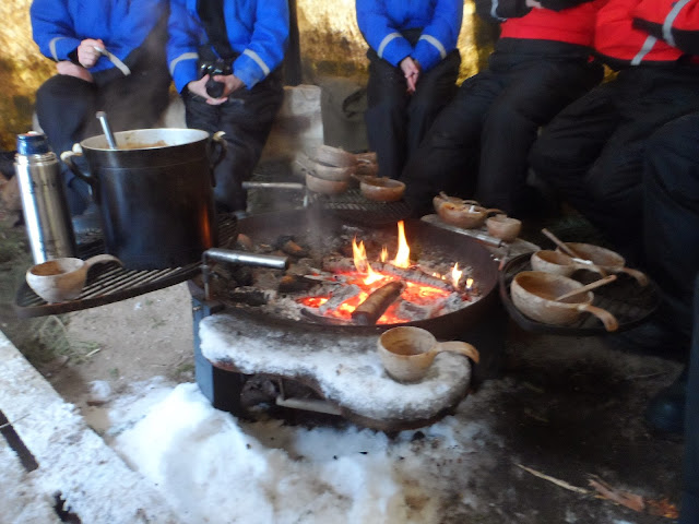 Lucky me I had matches and about 20 minutes to light a fire and warm the soup while the tourist group was driving some more kms. My professional companion told me, leaving me and the sledge at the shelter, that I should just try and do what I'm able to do. He would help me as soon as they were back. But I wanted to proof that I can figure it out by myself! There was no limit to my ambition. I really had to be successful; otherwise that would have been a damaging blow to my pride-how complicated can it possibly be to lit a fire in a tent without suffocate in dense smoke or burning down the tent. One woman, one package matches, one mission- there we go! The first attempt didn't work and first flames extinguished quickly. The trick is to make sure it gets enough oxigene and to make it burn really well and hot, if you don't want to have the tent full of smoke. It worked perfectly and the soup was already warm when my group arrived.